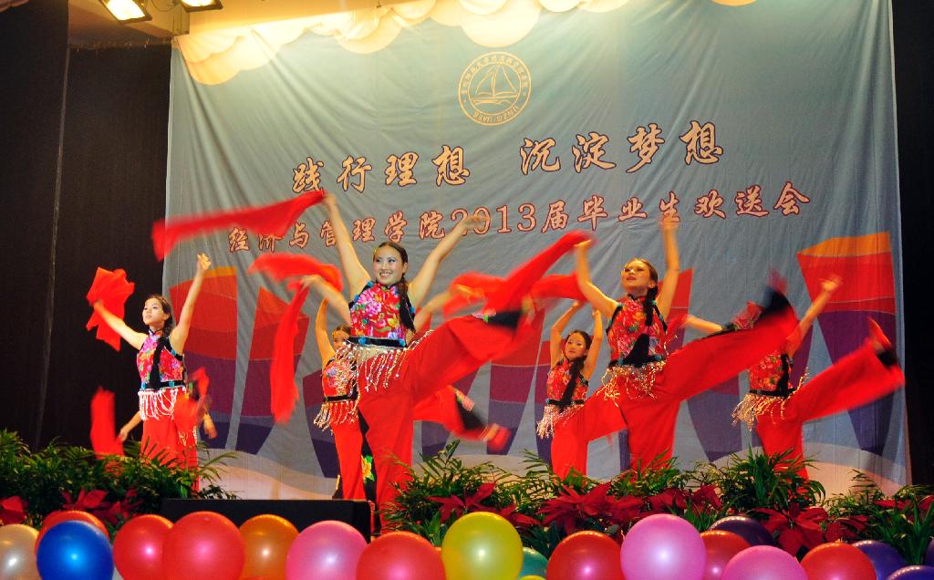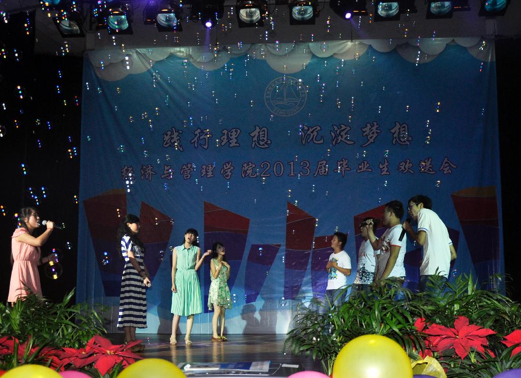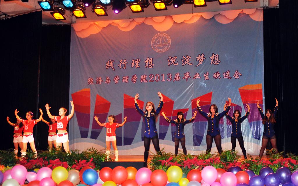 欢送会在活力十足啦啦操《篮球宝贝》中拉开帷幕。学院艺术团印度舞《异国神韵》充满浓厚的异国风味,演员们轻飘浮动的丝带、摇曳的身姿、优美的动作将印度舞的神韵展现得淋漓尽致,让在场观众仿佛身临其境,陶醉在异国风情当中;而红色舞蹈《黄河颂》,则以截然不同的风格,完美的造型,整齐的舞步,为大家展示出五彩斑斓的青春画面;2010级学生会爵士舞《Hot summer》,给大家带来不一样的青春感受;2011级电子商务专业《面朝大海,春暖花开》激励着毕业生们继续奋斗;青年教师歌曲串烧《青春舞曲》点燃了现场的激情,把大家带入回忆青春的点滴之中;2010级公共事业管理专业歌舞剧《梦想社》形式多样的歌舞,欢快的曲调,令人心情激荡,让在场观众思绪万千。欢送会气氛热烈、高潮迭起、精彩纷呈,为2013届毕业生送上最美好的祝愿。