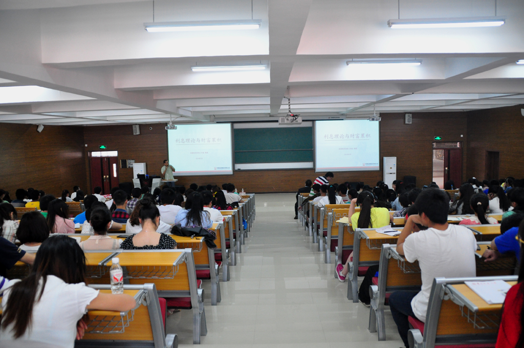 首先由王樨介绍了华泰的创立和发展史,随后他们的公司人员通过智能手机、银行卡、身份证对我们进行证券开户展示。接下来陈述了如何进行理财,华泰理财产品要有什么样的优势,并现场进行了提问,对回答问题正确的同学给予礼品奖励。接下来是景勇围绕“利息理论和财富累积”,通过介绍利息、财富、股票这几大点进行逐步展开,着重介绍了股票的概念、股市、影响股价的因素,通过余额宝的投资的案例,阐述了他对股票的认识,随后他和同学们分享了他参与股票十多年的经验。胡迪辉介绍了“当互联网遇上金融”,他的核心观点是同学们认识互联网既有一定的冲击,也有机会存在。讲述了互联网运行的模式有阿里巴巴电商平台金融生态圈、P2P、第三方支付等,分别介绍了互联网运行模式,通过表格向同学们展示了金融超市的成果。提出了互联网是否足以颠覆传统金融的疑问,阐述了手机和网上用户的数据变化;比较了互联网金融和传统金融的区别。