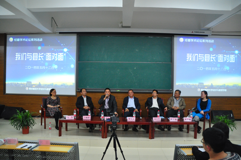 5月12日晚,73882必赢网页版在花溪校区GJ6202开展“我们与县长‘面对面’”交流会,本次交流会邀请了贵州省安龙县常务副县长王敬贵、晴隆县常务副县长毛仕城、望谟县常务副县长李选志、册亨县常务副县长何正祥、贵阳市公共资源交易中心副主任郑卫城、凯里学院旅游学院副院长顾永泽等领导和学者。交流会由我院院长吕萍主持,学院党委书记巴建伟、副院长王立伟、党委组织员赵本喜以及教师代表出席交流会,我院2011、2012、2013级经济学专业全体学生和其他专业学生代表共计300余人参加交流会。
