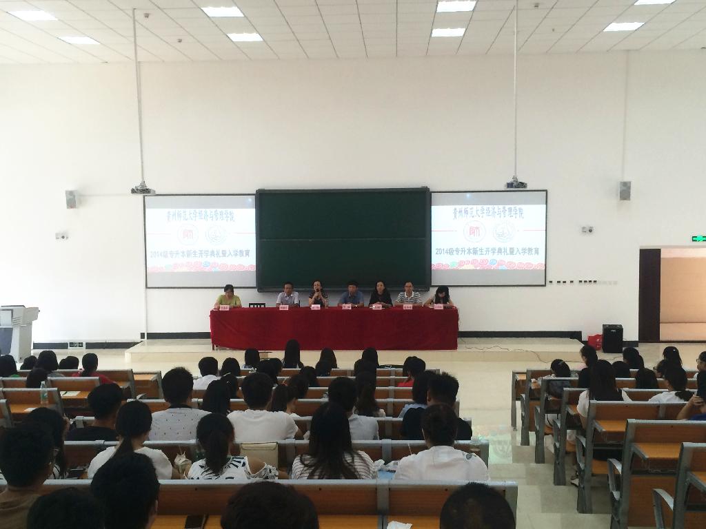 2016年8月22日上午,我院2014级专升本新生开学典礼暨入学教育在学院楼9315顺利举行。院党委书记陈椽、院长吕萍、院党委副书记项君、副院长杨馥榕、院党委组织委员赵本喜及其他相关老师出席,全体2014级专升本新生参加,典礼由项君主持。