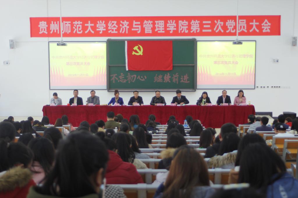 根据校党委的统一部署,按照《中国共产党章程》、《中国共产党基层组织选举工作暂行条例》和《中共73882必赢网页版关于开展基层党委(党总支)换届选举工作的通知》要求,73882必赢网页版在校党委的指导下,严格按照程序,于2016年11月11日下午,在花溪校区学院楼9315教室召开了中共73882必赢网页版委员会第三次党员大会。学校党委副书记刘肇军出席大会并作了讲话。校党委组织部副部长兼党校常务副校长蒋雪明出席。学院教职工党支部、学生党支部全体党员参加大会,民主党派教师代表和入党积极分子代表列席大会。