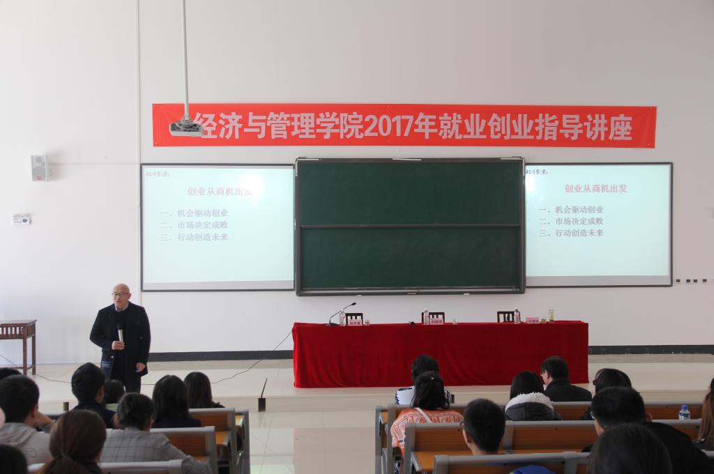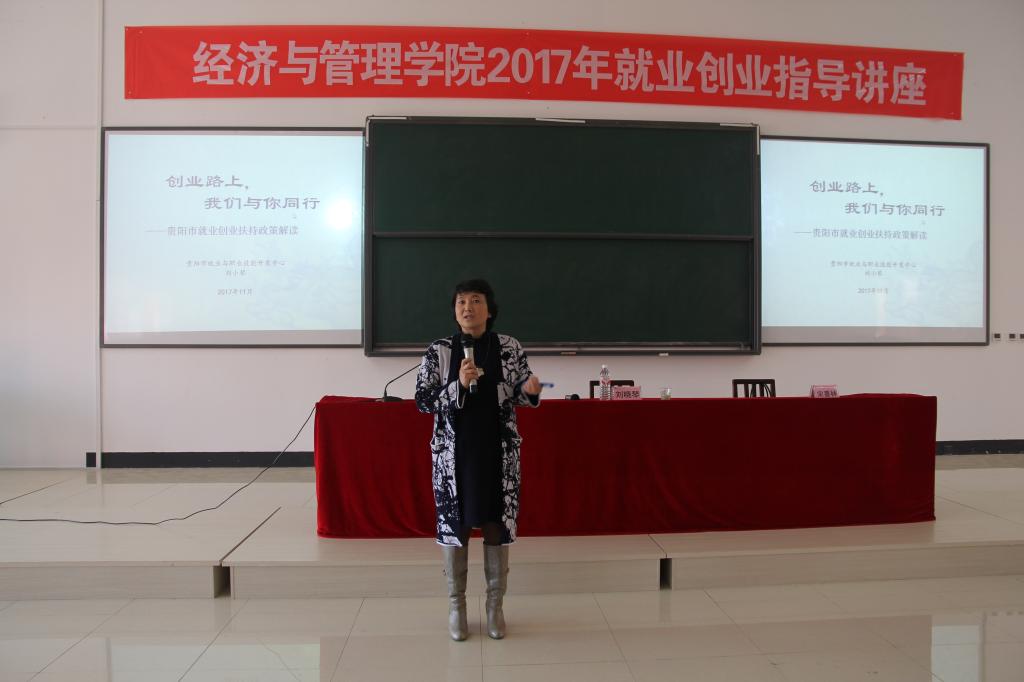 为深入学习宣传贯彻落实党的十九大精神,贯彻落实关于“鼓励创业带动就业”、“提供全方位公共就业服务,促进高校毕业生等青年群体、农民工多渠道就业创业”等重要部署,培养和提高学生就业创业能力,我院于 2017 年 11 月 27 日下午在学院楼 9315教室举行了“2017 年就业创业指导讲座”。贵阳市就业与职业技能开发中心副主任刘晓琴、贵州省党委经济管理教研部副教授宋喜林出席并为大家做专题讲座,我院2014级、2015级400余名学生聆听了此次讲座,本次讲座由我院党委副书记赵本喜主持。