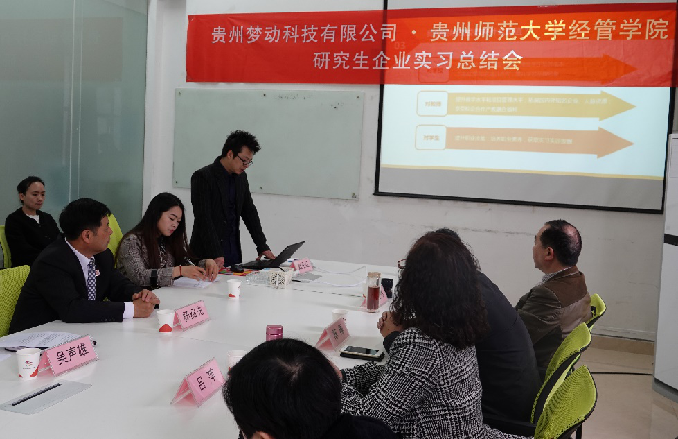 2018年3月28日,我院2016级职业技术教育(财经商贸)专业学位研究生企业实习总结大会在贵州梦动科技有限公司会议室举行。学院党委书记陈椽、院长吕萍、贵州盛华职业学院常务副校长杨绍先、贵州梦动科技有限公司校企合作部经理赵永红等老师及实习研究生参加了会议。会议由贵州梦动科技有限公司吴声雄主持。