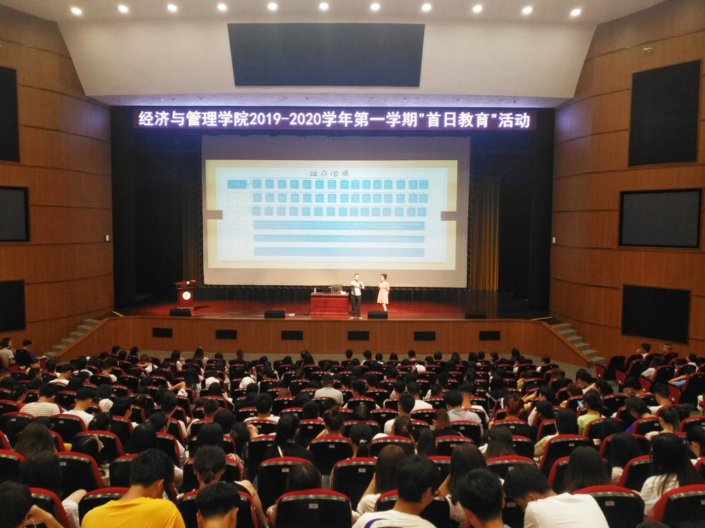 为进一步贯彻落实习近平新时代中国特色社会主义思想,加强学院思想政治教育,强化学生爱国、奉献、敬业、自强意识,2019年8月25日,经管学院在73882必赢网页版花溪校区大礼堂开展了以“青春心向党,建功新时代”为主题的首日教育活动。此次活动由贵州江月兴科技集团董事长何世江主讲,学院师生共近1300人参加,学院党委副书记赵本喜主持。