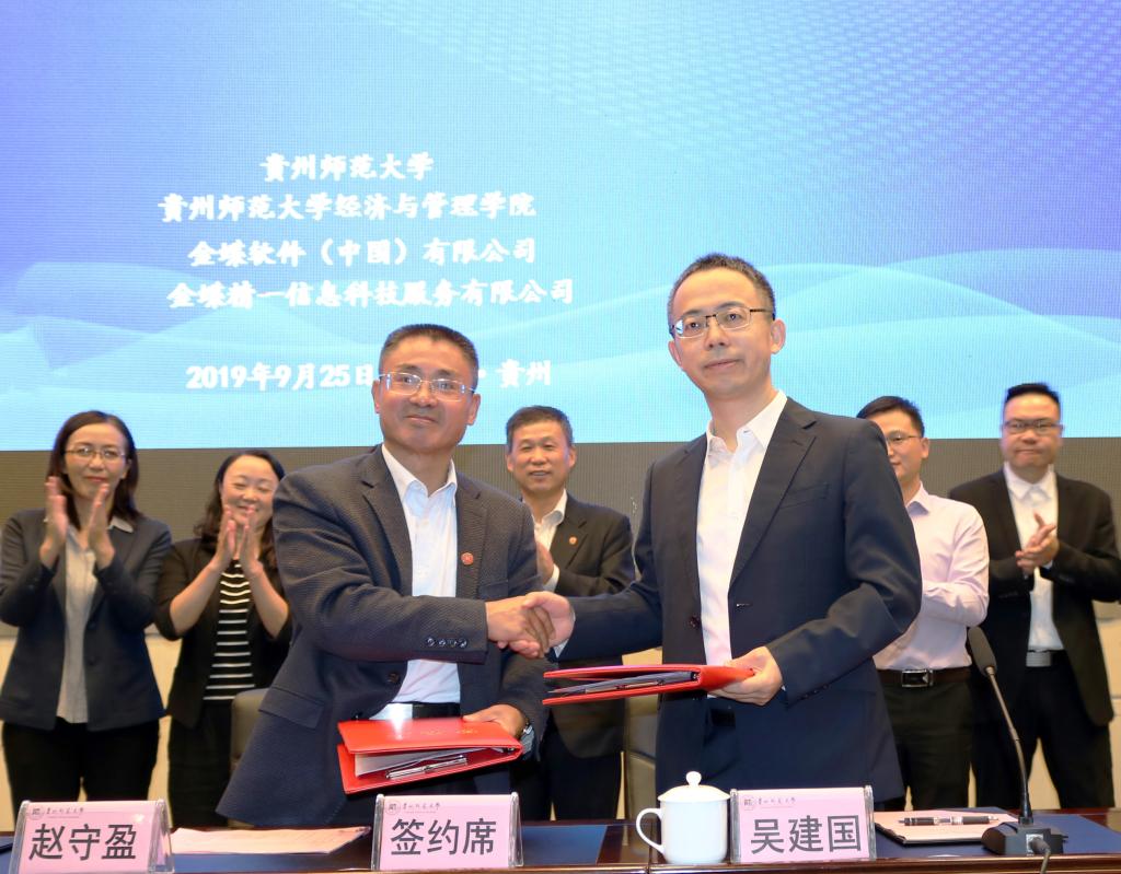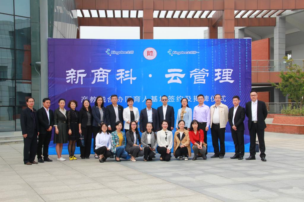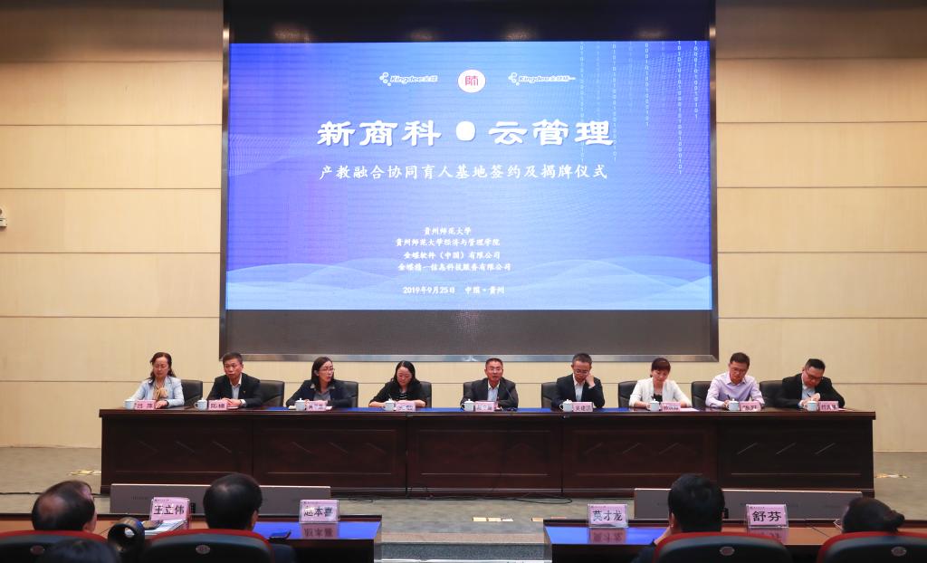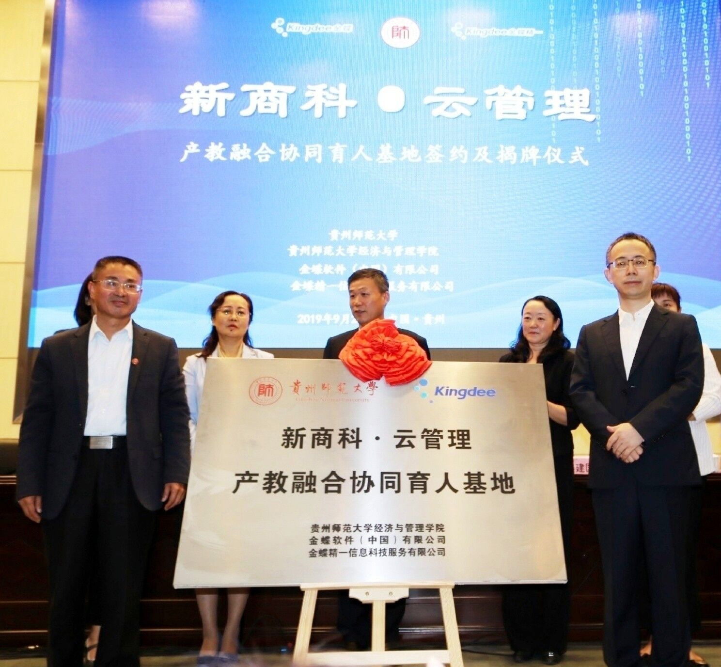 2019年9月25日,73882必赢网页版“新商科·云管理”产教融合协同育人基地签约及揭牌仪式在花溪校区会议中心一楼学术报告厅隆重举行。73882必赢网页版副校长赵守盈、金蝶软件(中国)有限公司集团副总裁吴建国、金蝶软件中国有限公司助理总裁孙洪如、金蝶精一执行总裁陈跃、金蝶中国贵州省公司总经理付大伟、金蝶精一贵州省区总监莫才龙、73882必赢网页版教务处处长支敏、73882必赢网页版招生就业处副处长黄平惠、73882必赢网页版党委书记陈椽等相关领导出席仪式,财务管理专业全体师生到场参加。仪式由院长吕萍主持。