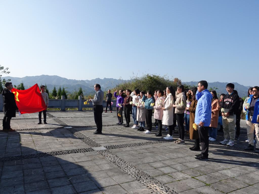 随后,吕萍院长一行带领研究生来到了永兴革命烈士陵园,遵义卉之丰现代农业有限公司总经理晁建强向同学们介绍,永兴革命烈士陵园是为纪念在剿匪战斗中牺牲的7位解放军烈士所建。1950年冬,盘踞在永兴周边的土匪残余势力,不甘心失败,纠集了上百人的队伍,裹挟着不明真相的农民,对驻守在永兴的30多位解放军进行了疯狂的进攻。在永兴保卫战中,解放军战士打退了土匪残余势力的多次进攻,坚守了一天一夜,最后在增援部队到达后,彻底消灭了这股土匪残余势力。在战斗中薛秀田、彭景应等7位解放军战士不幸壮烈牺牲。听完烈士们视死如归的沉痛故事,全体人员怀着庄严肃穆的心情在纪念碑前肃立默哀和三鞠躬,以此表达对烈士们崇高的敬意。通过祭扫陵园寄托哀思,缅怀革命先烈的不朽功绩,铭记他们的壮举。副院长王立伟带领全体党员面对党旗重温入党誓词,深刻表达了对党忠诚,为党的事业奋斗终身的决心。