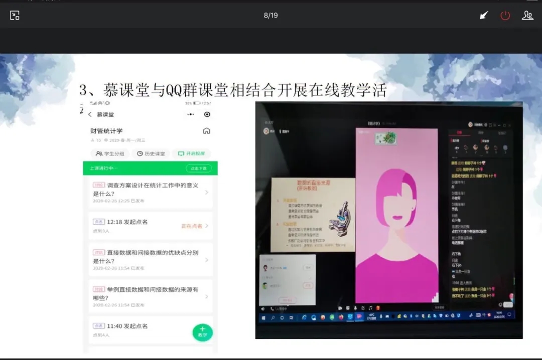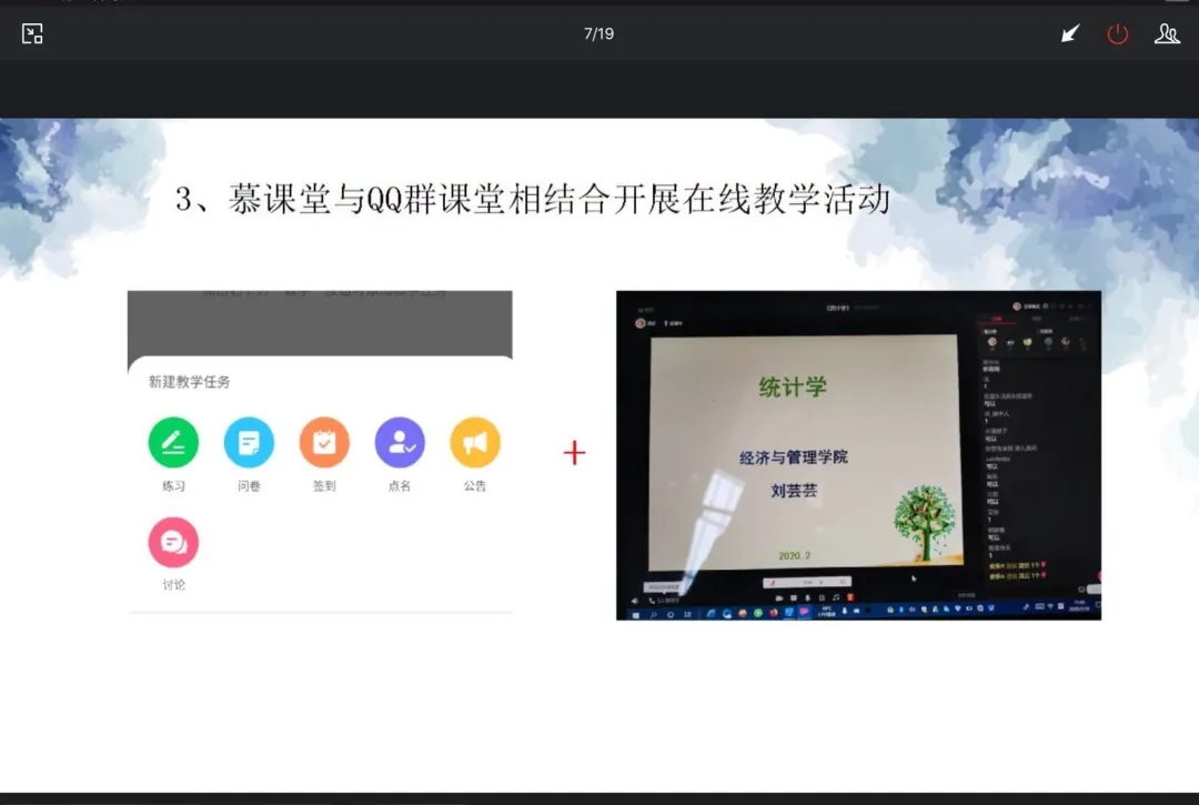 会上,老师们既分享了经验,也提出了困惑。如李孔俊老师、易静老师、康文峰老师利用假期提前构建课程资源,对在线课程的各个环节进行精心设计,采用互动式教学模式,引导学生积极思考;《市场营销学》课程团队的杨馥榕老师、《统计学》课程团队的刘芸芸老师分别通过文档演示详细地与大家分享了中国大学MOOC平台开课初体验和 “同步”+“异步”的混合式教学模式,使教学更加灵活实用;刘晓婧老师从教学质量监控方面对老师的在线教学工作提出了建议及要求。同时,老师们也提出了共同面临的困惑,诸如网络拥堵带来的平台卡顿、数据不同步、如何对学生听课进行有效的监控等等问题。与会老师各抒己见,达成一些共识,尝试在今后的教学中及时进行改进和优化。