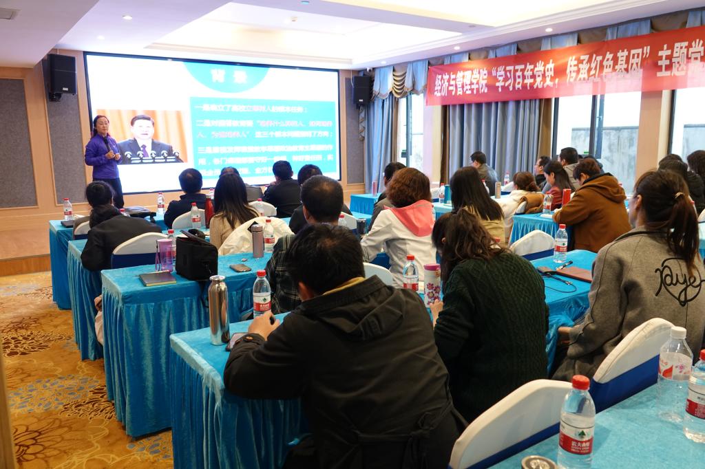 为进一步落实党史学习教育和“牢记殷切嘱托、忠诚干净担当、喜迎建党百年”专题教育的重要部署,将党史学习教育的成果转化为干事创业的强大动力,16日下午,学院组织全体党员教师开展了“‘先进典型’讲党课、‘师德标兵’话心得”活动。活动在同志们激情高涨的《没有共产党就没有新中国》歌声中拉开帷幕。学校“十佳党支部书记”获得者、“双带头人”党支部书记、我院市场营销系教工党支部书记杨馥榕老师围绕“新文科与‘课程思政’建设”交流了自己的思考和理解;学校“师德标兵”获得者、我院信管专业龙海老师就“新时代师德师风塑造”分享了自己的心得和体会。两位老师真情实感的发言不时引发与会同志的掌声和共鸣!