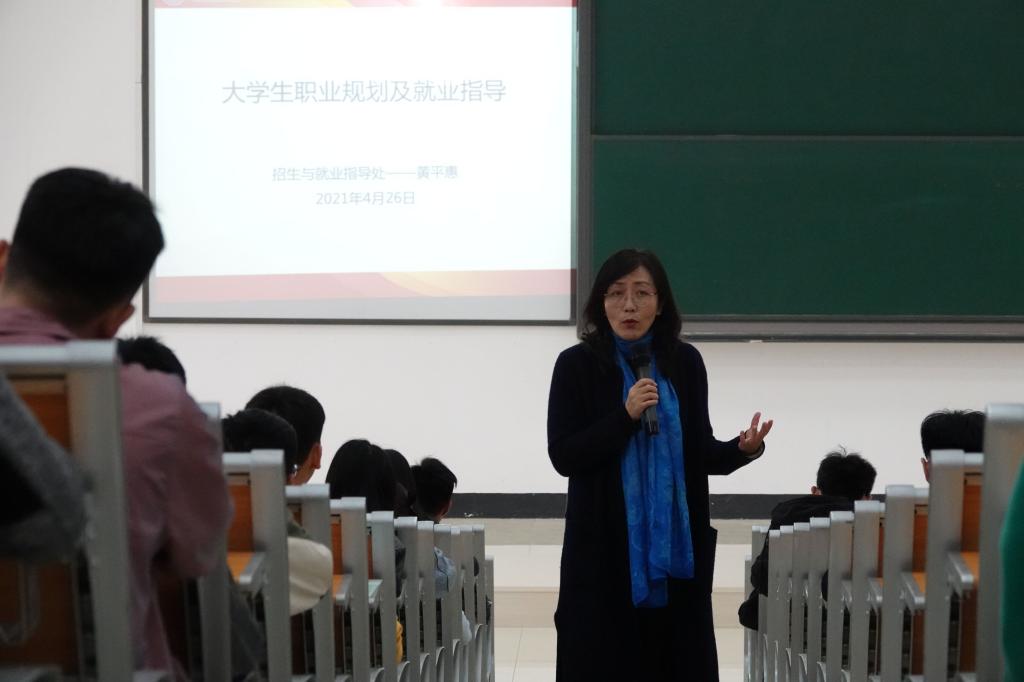 为引导同学们积极就业,我院邀请了招生与就业指导处黄平惠处长为同学们做职业规划与就业指导讲座。黄处长以分享交流的方式、用生动的语言、鲜明的事例围绕当前毕业生所面临的就业形势与问题进行分析。她强调同学们要认清自己身份的转变,肩负起身上的责任,尽早在思想与行动上做准备,积极规划自己的人生与职业,迈好从大学走向社会的重要一步。他针对本学院学生就业现状以及在择业时面临的问题等进行了深入分析,并切合实际的提出相应的要求。她要求同学们正确看待当前的就业形势、学会分析自己的长处与短处、回顾大学四年来的收获、积极转变就业观念。