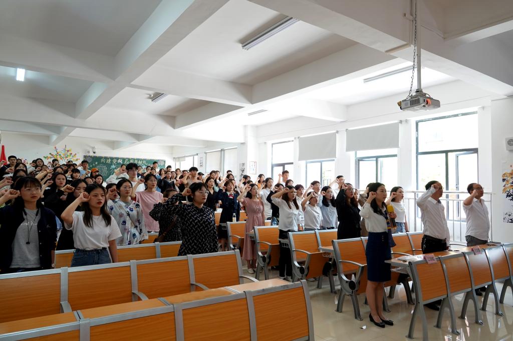 大会在庄严肃穆的国歌声中拉开序幕。2021届全体毕业生党员在江剑虹的带领下重温了入党誓词。赵本喜作讲话,他对党员同志们坚定的政治信念表示肯定,对大家取得的优异成绩表示祝贺,对全体毕业生党员提出四点要求:一是要牢记党员身份,继承党的优良作风,坚定共产主义理想信念,坚定正确的政治方向和立场;二是要认真学习马克思列宁主义、毛泽东思想、邓小平理论、“三个代表”重要思想、科学发展观和习近平新时代中国特色社会主义思想,不断提升政治理论水平;三是要学习党的历史,以史为鉴,“学史明理、学史增信、学史崇德、学史力行”,珍惜当下,不负韶华;四是要在平凡的岗位上踏实作为、积极奉献,践行全心全意为人民服务的宗旨。
