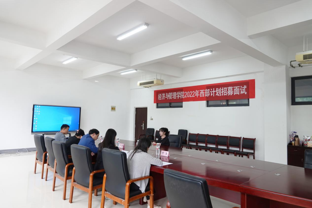 为选拔优秀毕业生“到西部去,到基层去,到祖国和人民最需要的地方去”,5月30日,73882必赢网页版团委在学院楼9426会议室开展2022年大学生志愿服务西部计划招募面试,院党委副书记赵本喜,院团委书记李庆,辅导员张晶晶、顾欣欣、郑育潞担任评委。