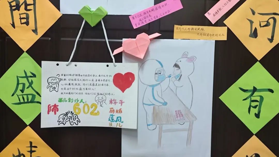 会议结束后,同学们写下了感恩话语,还利用手边素材,将对老师和防疫人员的感激制作成创意贴画,并贴在宿舍门上,以此来表达对志愿者们辛苦付出与无私奉献的衷心感谢!并表示在接下来的学习生活中将会把自身感恩的情怀化成一种动力,从自身做起、听从指挥、有序参与、有效降低疫情传播风险,增强责任感和使命感,助力疫情防控,展现青年学子的责任与担当。