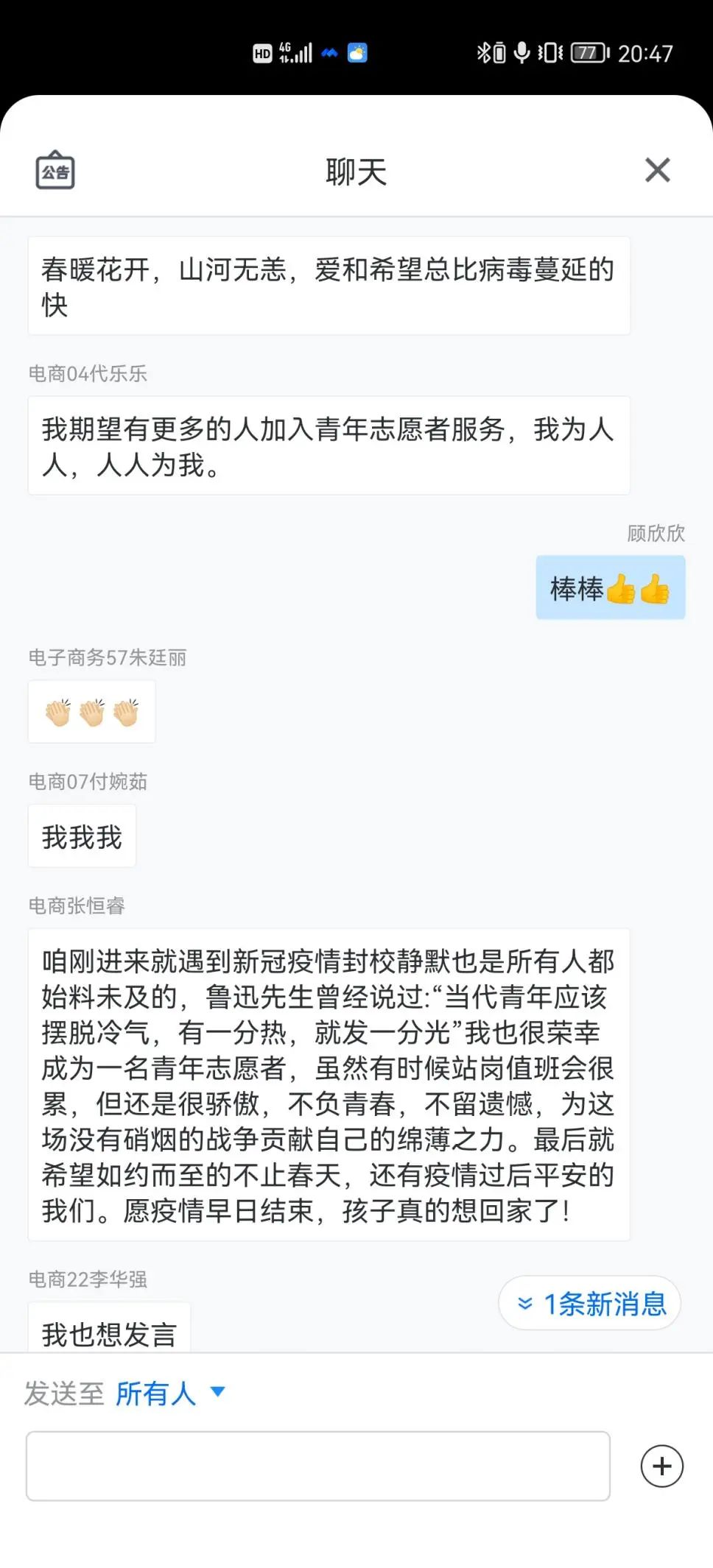 2021级财务管理班的同学说:“‘积力之所举,则无不胜也;众智之所为,则无不成也’,要打赢这一场疫情防控战,我们需要有‘壮志如铁’的决心,也需要有‘精准用力’的细心,更需要有‘风雨同舟’的真心,凝聚众智,汇聚众力,我们就将所向披靡,无坚不摧,同学们加油”!
