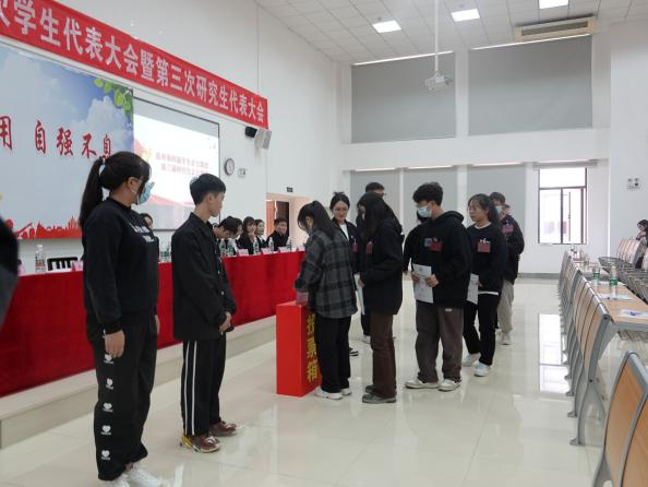 第三届学生会主席团成员彭慧娟代表第三届学生会作《慎思笃行、博学致新,开创学生会服务学生新局面,经世致用、自强不息,搭建学生成长成才和谐舞台》的工作报告。第二届研究生会主席团成员薛著文代表第二届研究生会作《奋楫笃行、臻于至善、自信自强、守正创新,无私奉献、迎难而上,推进研究生会更好、更快高质量发展》的工作报告。