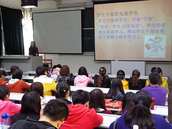 会上,江剑虹老师针对学生干部工作的内容,从培训学生干部应具备哪些素质入手,以角色定位、应具备的素质和能力、需处理好的几种关系、需要具备的态度和为追逐梦想而努力为主线展开。重点讲解了对大学生干部;思想品德、能力、身体和心理素质;纠正错误的认知、学会正确处理各种人际关系等的解读;并强调了责任心、谦虚心、“阿Q精神”、学习心态的重要性。她希望学生干部能通过此次培训提高自己、完善自我、有目标和追求、乐于助人,在接下来的时间里把学院工作推上一个新台阶。