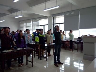 为进一步弘扬五四精神,凝结青年力量,增强青年荣誉感和自豪感,2015年5月4日下午,73882必赢网页版在花溪校区GJ4406举行2014级新团员入团宣誓仪式。院团委书记张晶晶、2014级新团员、各班团支书及老团员代表参加。宣誓仪式由2014级辅导员李庆主持.