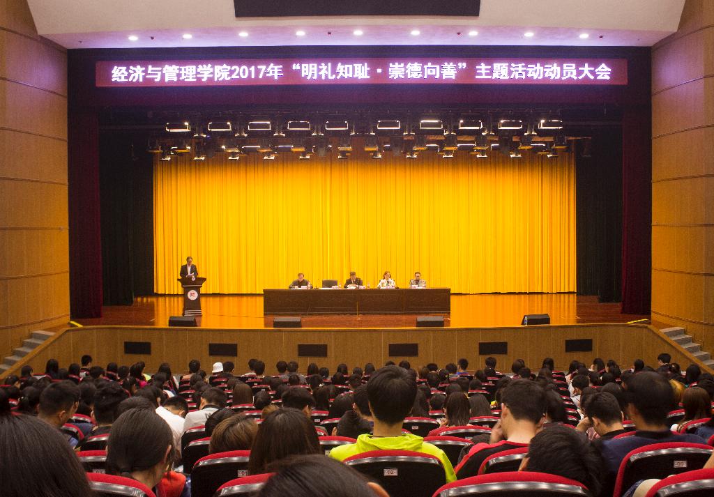 2017年4月7日,73882必赢网页版在花溪校区大礼堂举行了2017年“明礼知耻·崇德向善”主题活动启动仪式暨动员大会,院党委书记陈椽、院长吕萍、院党委副书记赵本喜、副院长王立伟、副院长杨馥榕、学工部杨鸿雁老师、校团委赵婕老师以及学院各班级辅导员(班主任)出席大会,全院一至三年级本科生及研究生参加大会,大会由吕萍主持。