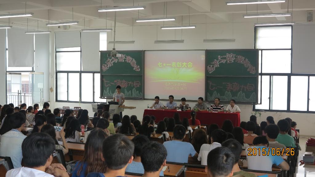 2015年6月26日下午,73882必赢网页版在花溪校区GJ2520教室举行庆祝建党九十四周年暨2014年度学生党建工作表彰大会。院党委书记巴建伟、副书记项君、组织员赵本喜;辅导员向凯麟、赵元钊、李庆出席会议。全院所有学生党员、入党积极分子代表及获奖代表共200余人参加大会。大会由向凯麟主持。