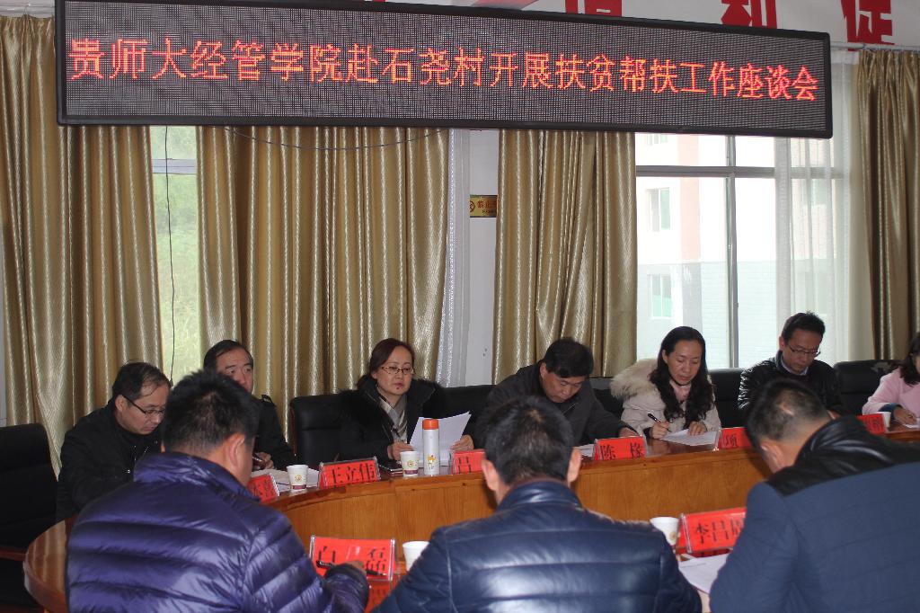 “两学一做”基础在学,关键在做。为了进一步深化“两学一做”学习教育,深入贯彻落实习近平总书记关于扶贫开发的重要指示精神和省委实施大扶贫战略行动的有关部署,响应学校把“两学一做”学习教育与脱贫攻坚有机结合的有关精神,积极聚焦脱贫攻坚主战场,在脱贫攻坚中实招迭出,贡献力量。2016年11月29日,73882必赢网页版赴石阡县坪地场乡石尧村开展党建扶贫活动,在石阡县坪地场乡会议室召开了扶贫帮扶工作座谈会,学院党委书记陈椽、院长吕萍等学院新一届党委委员、石阡县坪地场乡党委书记毛观定、乡长安元周及石阡县坪地场乡石尧村支部书记等出席座谈会。