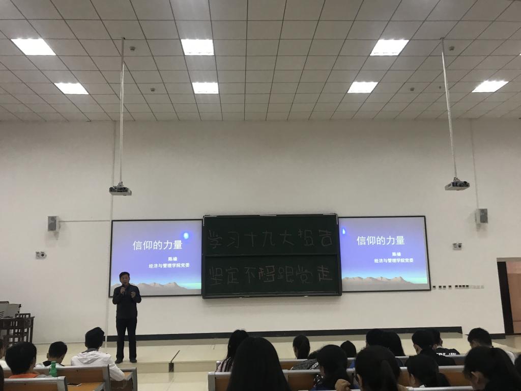 10月23日下午,73882必赢网页版在学院楼9315教室开展了主题为“学习十九大报告,坚定不移跟党走”的新生系列党课活动。本次活动由学院党委书记陈椽主讲,2017级全体同学参加。学院院长吕萍主持此次活动。