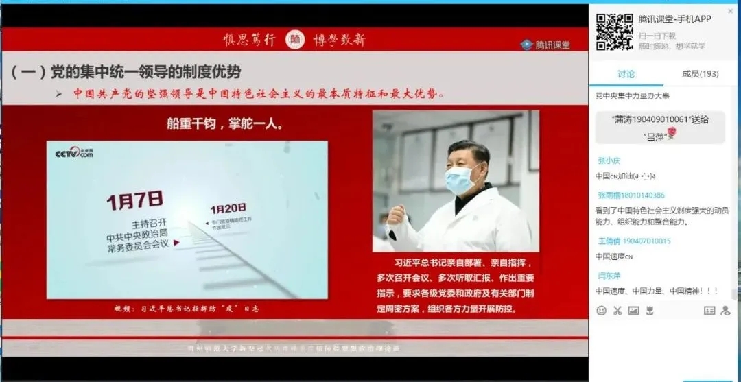 “我为自己是一个中国人而自豪!”“我爱我的祖国、我爱贵州师大!” 同学们隔着屏幕纷纷表达了自己激动的心情!通过此次党课,结合亲身经历,同学们的思想深受教育,感受到了祖国的强大、人民的团结,厚植了爱国主义情怀,坚定了“四个自信”。同学们表示,一定会履行入党初心,兑现入党承诺,充分发挥党员带头奉献、敢于担当的先锋模范作用,共同筑起疫情防控的铜墙铁壁,凝心聚力全力打赢疫情防控阻击战。