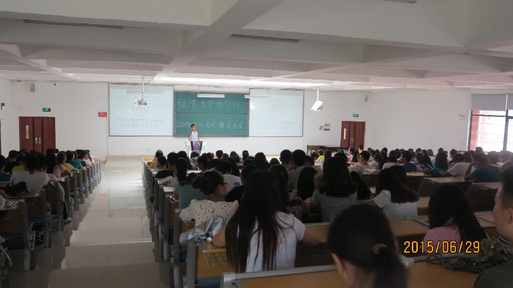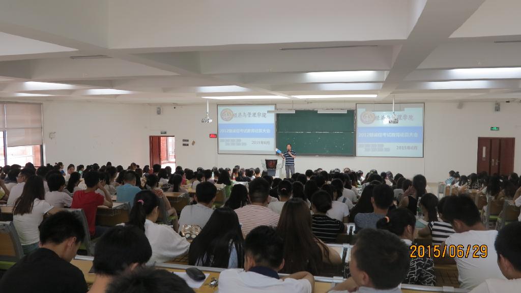 为营造积极向上的学习氛围,树立诚信考试的良好风气,6月29日下午,73882必赢网页版在花溪校区GJ6301教室开展了“学风考风教育”大会。这次大会总共分为三场,分别针对三个年级年级特点开展。学院党委副书记项君、党委组织员赵本喜、团委书记张晶晶担任主讲。辅导员向凯麟、赵元钊、李庆及各年级学生近千人分场次参加了大会。