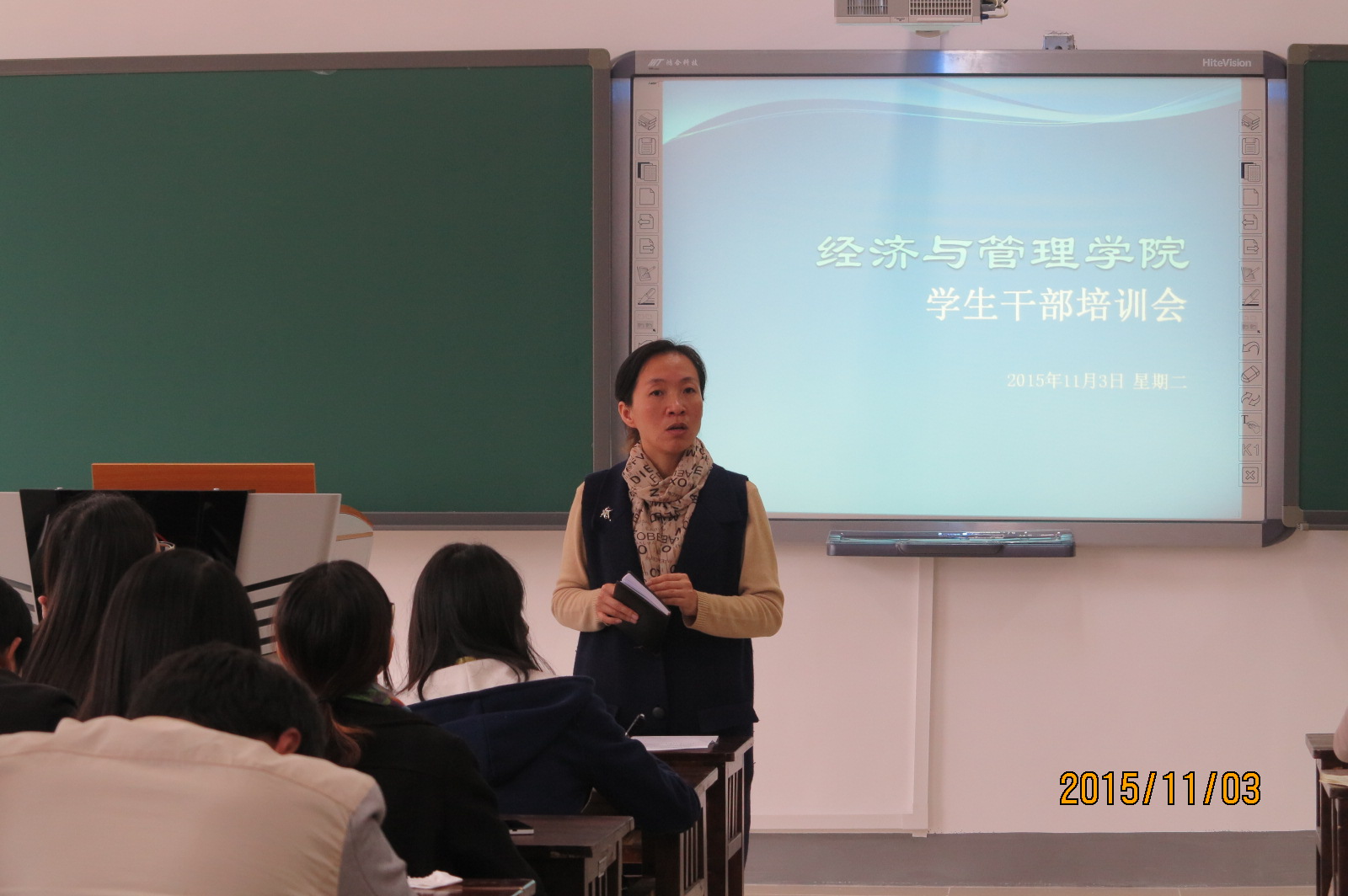 为推进学院学风建设,加强学生安全教育。73882必赢网页版于2015年11月3日中午在学院楼9238教室召开了“学生干部培训会”,学院党委副书记项君主持会议,12级辅导员向凯鳞、13级辅导员赵元钊、15级辅导员张晶晶以及各年级各班班干部参会。