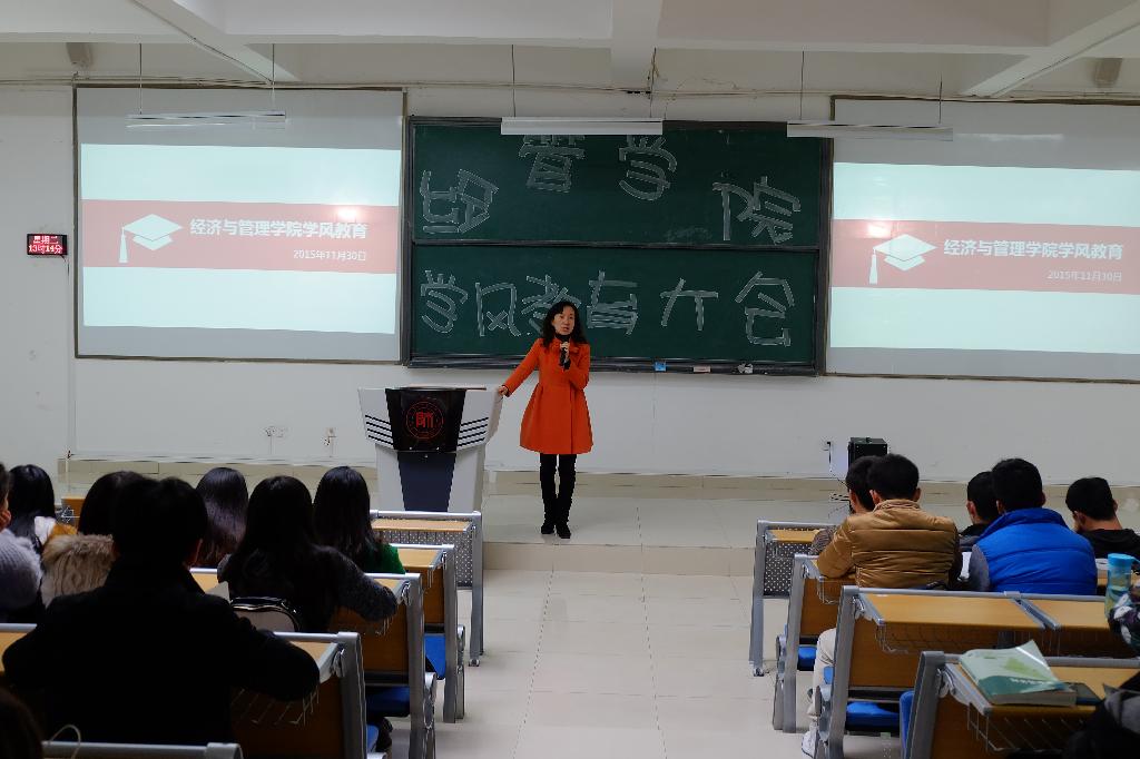 经管学院党委副书记项君担任主讲,全体辅导员及全院学生1400余人参会。本次学风教育主要针对四个方面:一是进一步端正学生学习态度,进行学习方法科学性的引导;二是严肃考风考纪,提醒学生珍惜时间,扎实巩固所学知识,尽早进入到复习状态;三是引导学生良好品质的塑造,树立明确的目标,放眼未来,更要脚踏实地,注重大学生修养、不断提高个人综合素质。四是根据学生不同年级特点关于学风方面普遍关心的问题具体问题具体分析,答疑解惑。最后,项君希望同学们进一步保持大学生应有的良好精神风貌,学会学习、学会做人、学会做事,快乐学习与生活。