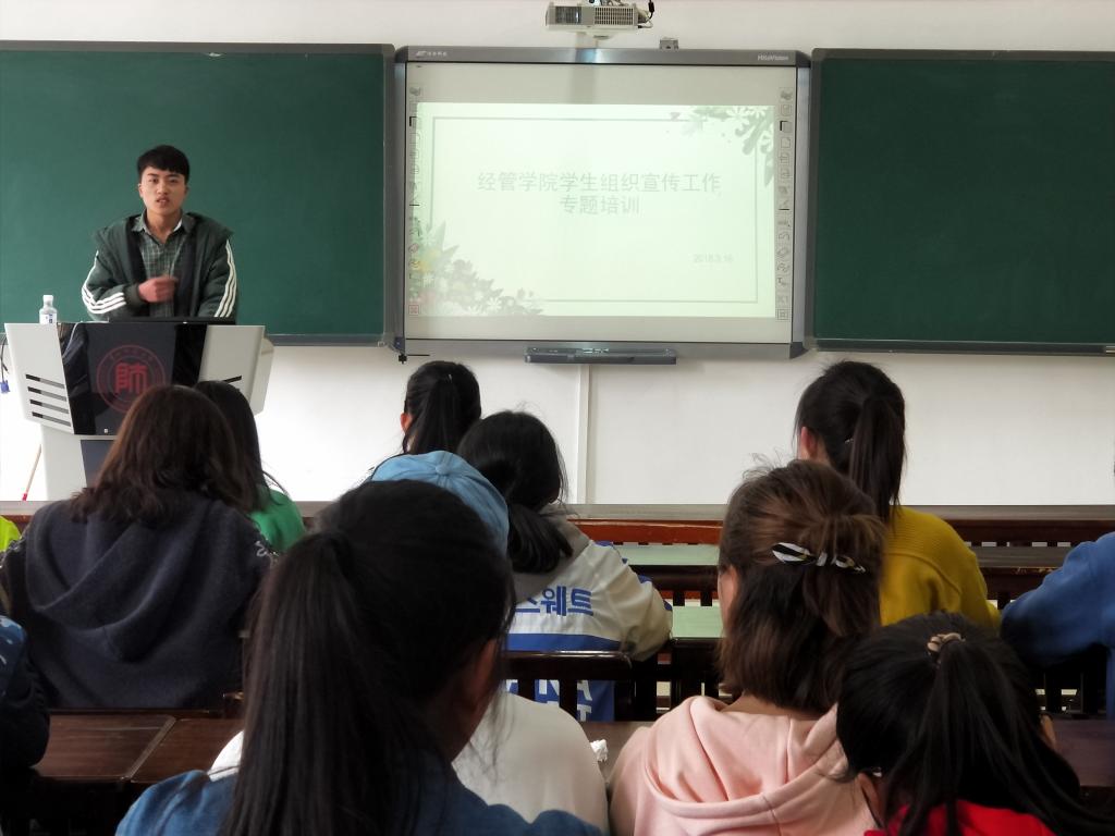 为加强学院宣传队伍建设,进一步提升学院新闻撰写、舆论引导和对外宣传工作水平,73882必赢网页版于2018年3月16日下午在学院楼9238教室开展了学生组织宣传工作专题培训。本次培训由2015级辅导员顾欣欣主讲。党建办通讯小组、学生会宣传部及青分会宣传部30余名同学参加了本次培训。