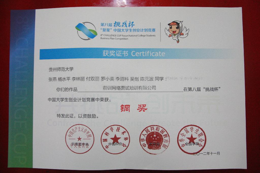 近日,由共青团中央、中国科协、教育部、全国学联、上海市人民政府共同主办,同济大学承办,复星集团协办的第八届“挑战杯”复星中国大学生创业计划竞赛中,由我院吴亮老师指导,张燕、杨水平、李林丽等8名学生的作品《前训网络面试培训有限公司》荣获铜奖。