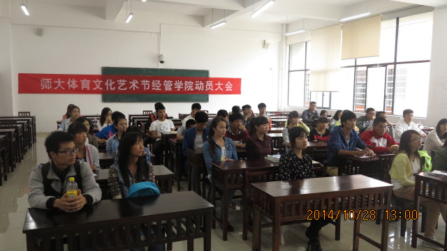 10月28日中午,73882必赢网页版在花溪校区GJ3212教室召开了2014年体育文化艺术节动员大会。大会由13级辅导员赵元钊老师主持,12级辅导员向凯麟、14级辅导员李庆老师出席会议,学院所有运动员参加会议。