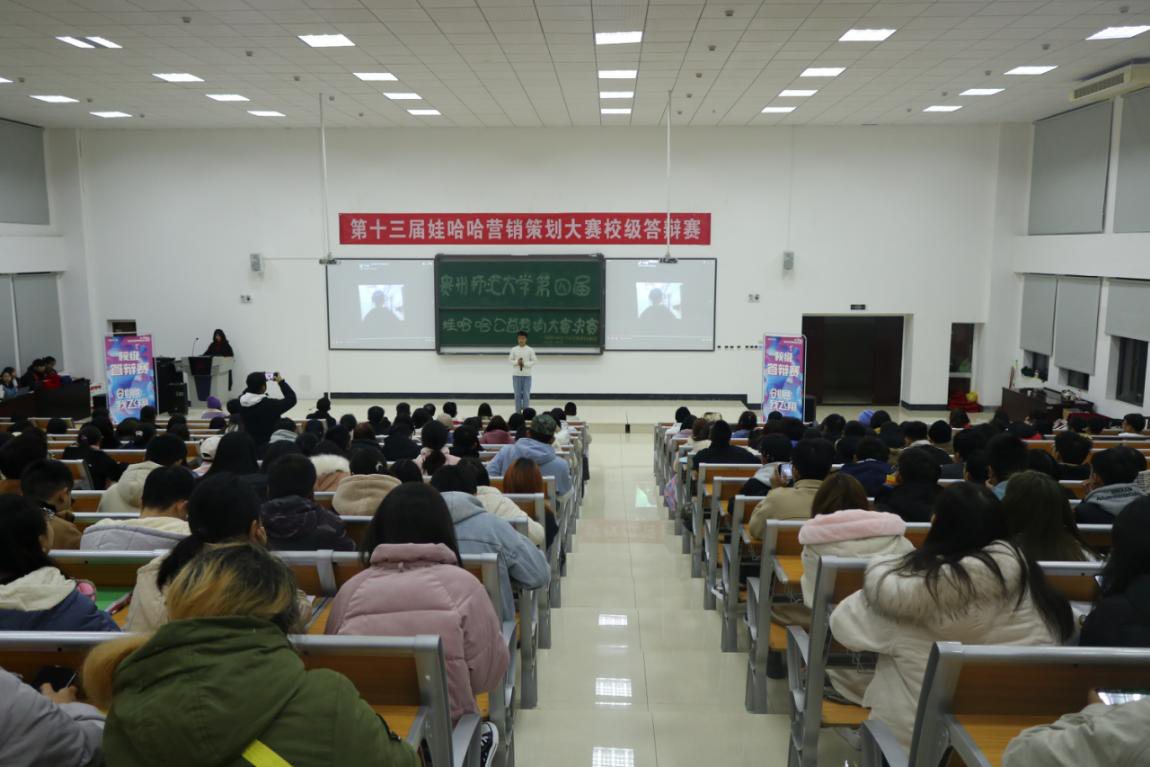 12月9日晚,73882必赢网页版“第四届娃哈哈公益营销大赛”决赛在学院楼9315教室举行。杭州娃哈哈集团有限公司贵阳市拓展总监毕俊、校团委干部张芳、院党委副书记赵本喜出席并担任本次大赛评委。学院近400名学生代表到场观赛。